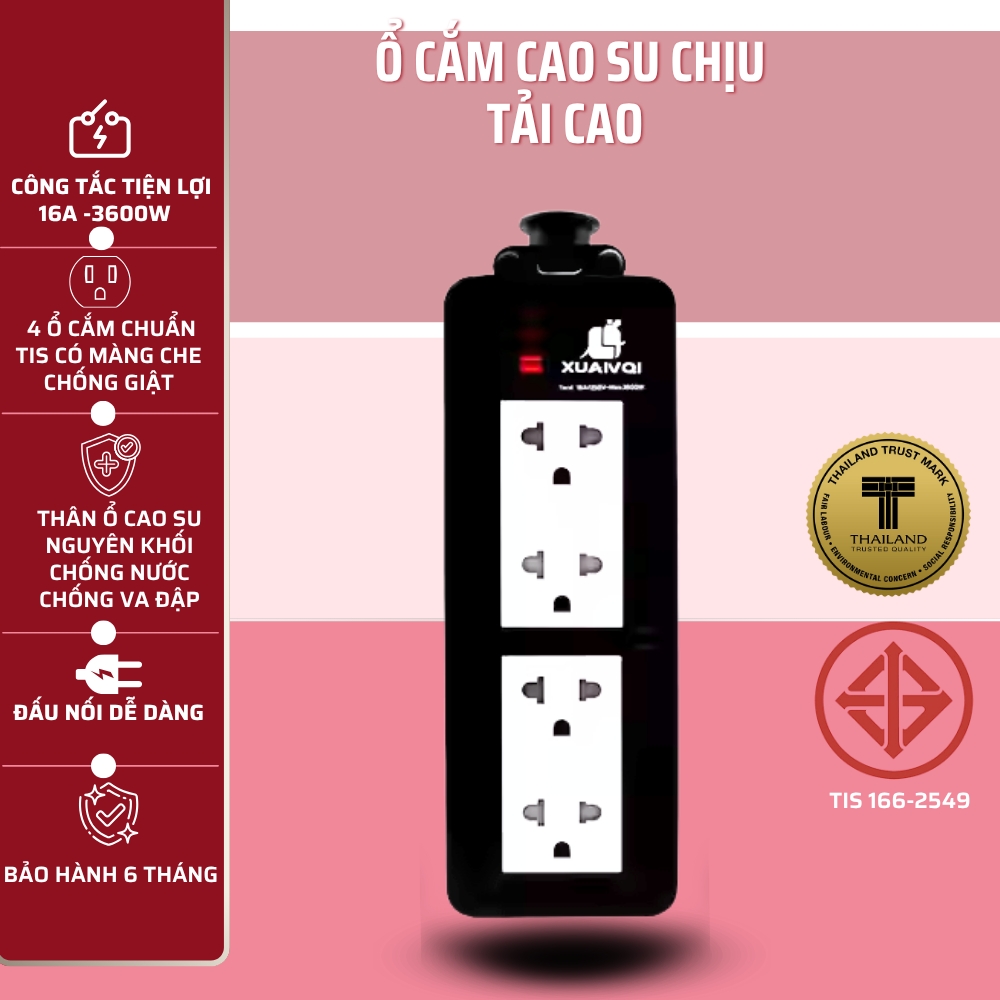Sản phẩm được cấu tạo từ cao su nguyên khối chống cháy, giúp giảm thiểu nguy cơ cháy nổ khi sử dụng ở cường độ cao. Phần lõi điện được làm từ đồng nguyên chất 100%, đảm bảo độ dẫn điện tốt, ổn định và tiết kiệm điện năng. Nhờ đó, ổ cắm chống cháy nổ này được ưa chuộng trong môi trường có yêu cầu cao về an toàn điện.