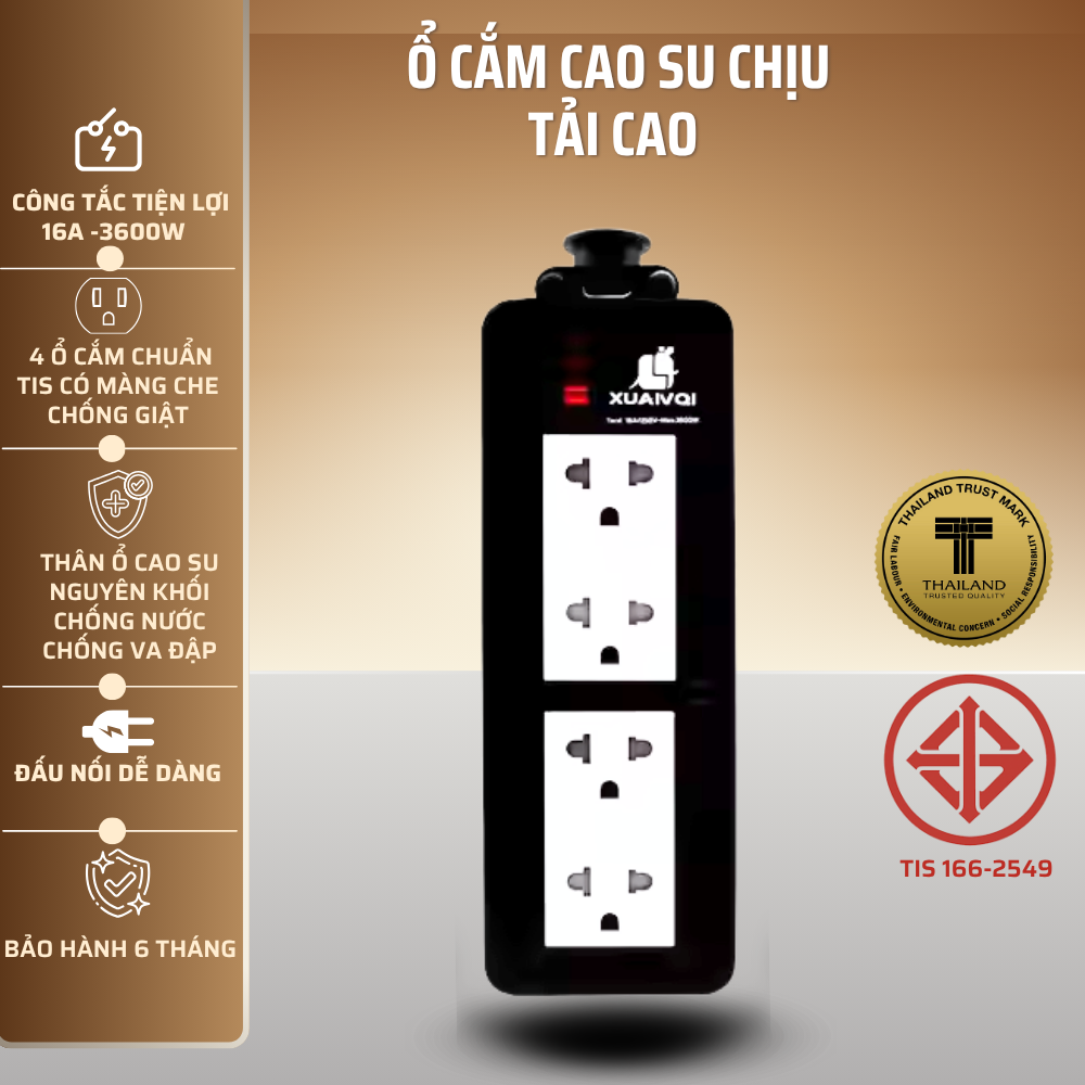 Sản phẩm được cấu tạo từ cao su nguyên khối chống cháy, giúp giảm thiểu nguy cơ cháy nổ khi sử dụng ở cường độ cao. Phần lõi điện được làm từ đồng nguyên chất 100%, đảm bảo độ dẫn điện tốt, ổn định và tiết kiệm điện năng. Nhờ đó, ổ cắm chống cháy nổ này được ưa chuộng trong môi trường có yêu cầu cao về an toàn điện.